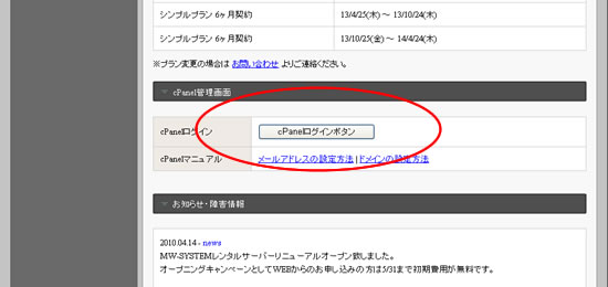cPanelのログインは管理画面にログインし管理画面内のボタンを押してcPanelにログインしてください。