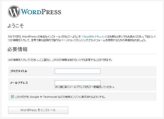 ブログタイトル / メールアドレスを入力し「WordPressをインストール」をクリックして先に進んでください。