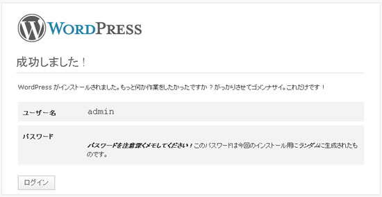 インストールが完了するとログイン情報が表示されるので確認しておいてください。「ログイン」をクリックして先に進んでください。
