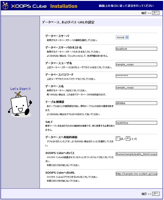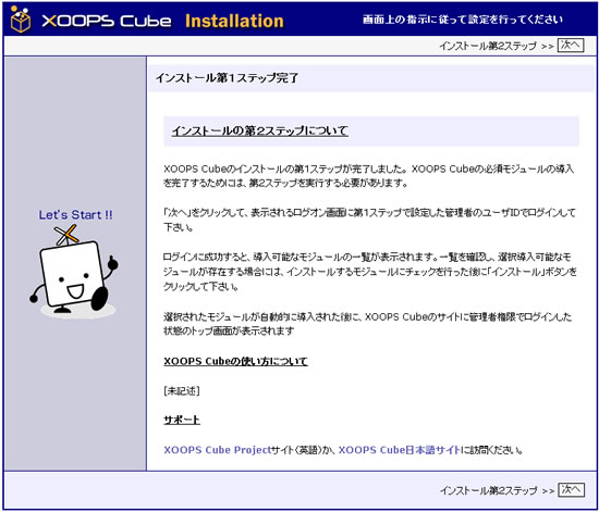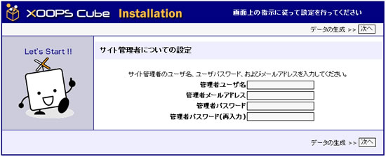 サイト管理者情報を入力後、「次へ」をクリックして先に進んでください。